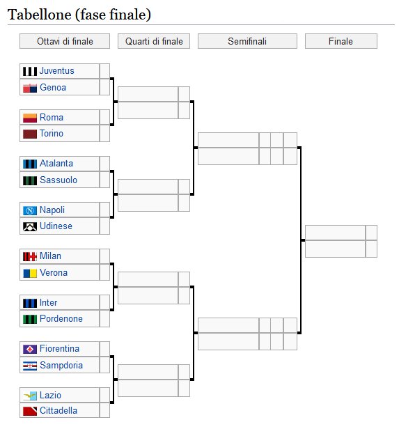 aaa ei, Coppa Italia on ikka cold deck/rigged püramiid turna, ma lahmisin suvalises järjestuses. e̶e̶l̶m̶i̶s̶e̶l̶ ̶a̶a̶s̶t̶a̶l̶ ̶e̶e̶s̶ ̶o̶l̶n̶u̶d̶ ̶k̶l̶u̶b̶i̶ ̶s̶a̶a̶b̶ ̶k̶o̶d̶u̶v̶ä̶l̶j̶a̶k̶u̶e̶e̶l̶i̶s̶e̶. tra ma ka ei tea, miks Lazio kodumängu sai ... aga korrektselt siis: